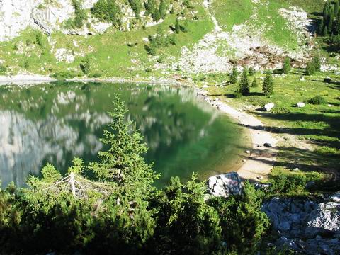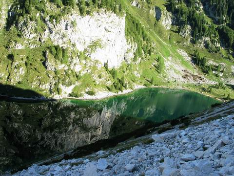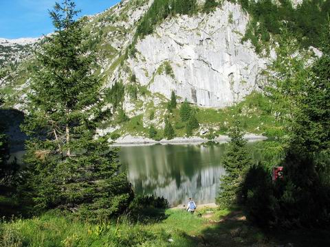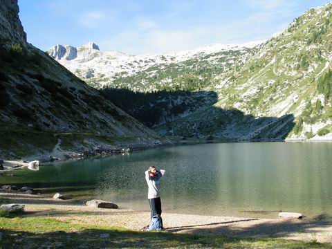 | Krnsko jezero velja za naše največje visokogorsko jezero, leži na višini 1391 metrov, je 400 metrov dolgo,150 metrov široko in na najglobljem mestu globoko 17.6 metrov. Jezero skoraj popolnoma poplavlja kotanjo v vznožju Krna, na katerega se nama ob 9:00 prvič odpre pogled prav z jezerskega brega. Voda niti ni tako mrzla, po moji oceni ima kakih 15°C. |