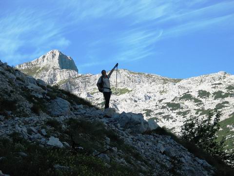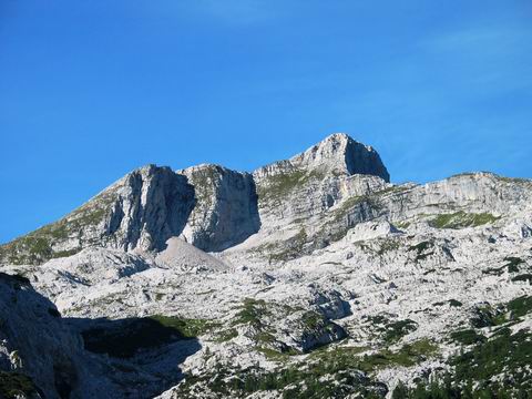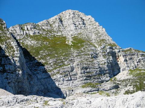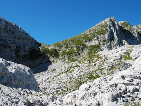 | Krn je vedno bližje, do vrha imava še kakšno urico, steza pelje malo bolj strmo v serpentinah navzgor do prelaza med pobočjem Krna na desni in Batognico na levi strani. |