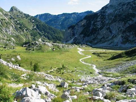 | Otovoriva se z nahrbtniki in ob 6:34 veselo na pot. Oskrbnik koče naju je že prejšnji dan »razveselil« s podatkom, da je do Krnskega jezera dobri 2 uri hoda, naprej gor do vrha Krna (2245m) pa še 3 ure. Pot do planinskega doma pri Krnskih jezerih (1385m) je delno speljana po stari mulatjeri, večinoma pa po gozdni dokaj kamniti stezi, ki se vije večinoma preko gozda, ki v teh poletnih mesecih zagotavlja učinkovito senco. |