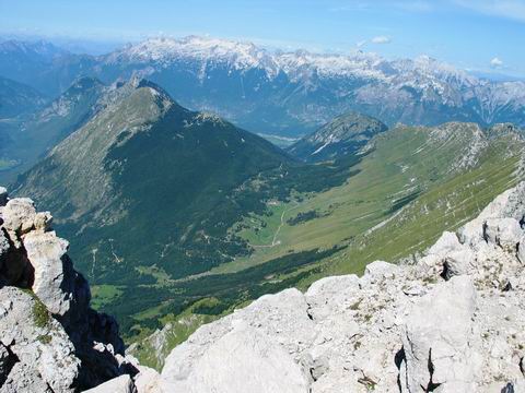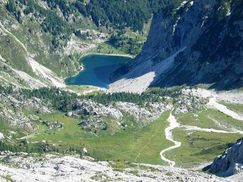 | Še en pogled navzdol na prehojeno pot in na Krnsko jezero, nato sestopiva nekaj deset metrov niže na primorsko stran po južnem pobočju Krna do Gomiščkovega zavetišča na Krnu (2182m) in si privoščiva pošteno zasluženo hribovsko malico visoko nad dolino Soče (13,65723 E / 46,26528 N). Južno Krn nima nobenih tekmecev, saj se tu začenja predalpsko hribovje. Lepi primeri za predalpsko hribovje na kobariškem so Matajur (1642 m), Stol (1673 m) in pogorje Morizne (Krasji vrh 1773 m), ki Krnu z nadmorsko višino 2245 metrov vsekakor niso dorasli. Krn daleč naokoli nima dostojnega tekmeca v višini, temu primeren pa je tudi razgled s Krna. Vidi se daleč v Furlanijo, Alpe, Julijske vršace ter veličastno dolino Soče. Zaradi takšnega razgleda mnogi uvrščajo Krn med najbolj razgledne gore pri nas. Relativna nadmorsko višina z doline Soče na Krn je ogromna (za Julijce). Kobarid leži na višini 234 m, potem pa preračunajte koliko je do 2245 m. Pod pobočji na južni strani je tudi veliko vasi: Drežnica, Drežniške Ravne, Koseč, Jezerca, Magozd, Vrsno in vas Krn. |