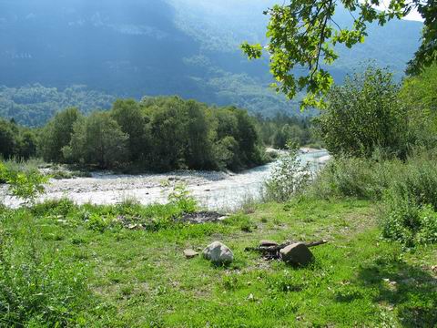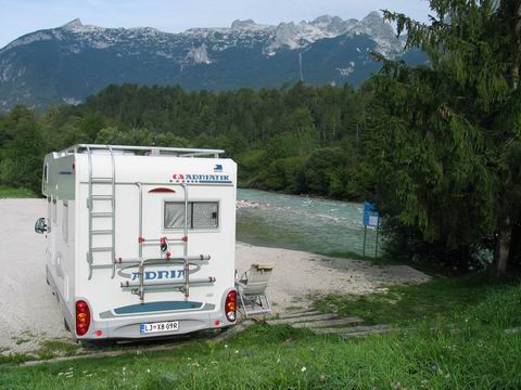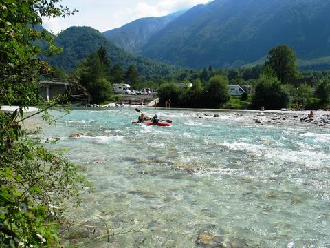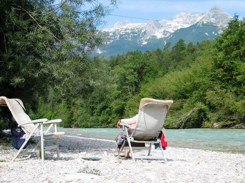 | Dopoldne naslednjega dne se odpeljeva proti Bovcu, zavijeva levo k Čezsoči in parkirava takoj za mostom na velik parking tik ob Soči (13,55318 E / 46,32452 N). Temperatura Soče dopoldne je 8°C, popoldne naraste do 11,5°C. Ležalnike odvlečeva nekaj nižje na obalo in regeneracija se lahko prične. Nekoliko sem nevoščljiv le množici kajakašev, ki se spuščajo po naši najlepši reki. Še sprehod po okolici ob vodi, sledi odhod proti domu. |