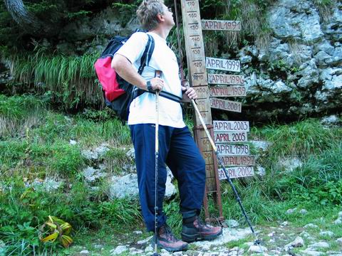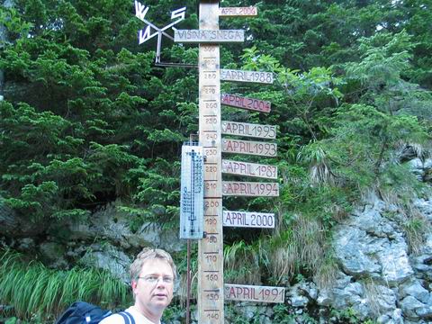 | No, ob tej zgodni uri sonca še ni, le okoliški gorski vršaci so že oranžno obsijani od jutranjega sonca. Tovorna žičnica je nad potjo speljana iz Lepene do zgornje ravnine in se po njej oskrbuje koča pri Krnskih jezerih. Če bom še kdaj hodil tukaj gor, se prijavim kot tovor, pa naj me kar žičnica potegne gor. Steza se ob gornji postaji žičnice zravna, kmalu je ob poti izviren merilec višine snežne odeje. Od leta 1987 vsako leto aprila izmerijo višino in na tram nabijejo ploščico z letnico. Letos ga je namedlo 3.5 metra, največ v teh letih. |