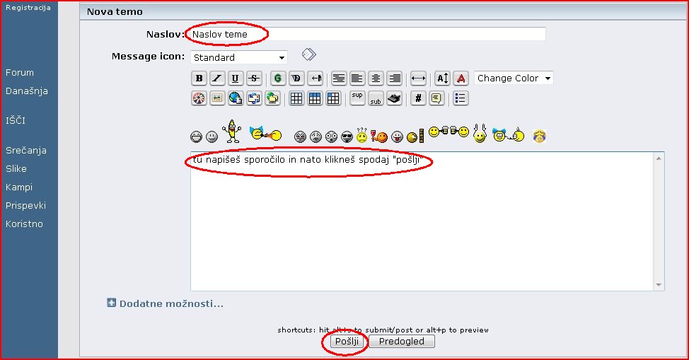 Na strani, ki se odpre vpišete naslov teme (ta naj odraža vsebino a naj ne bo predolg). Potem pač napišete sporočilo in na koncu kliknete na pošlji. Sporočilo je objavljeno.