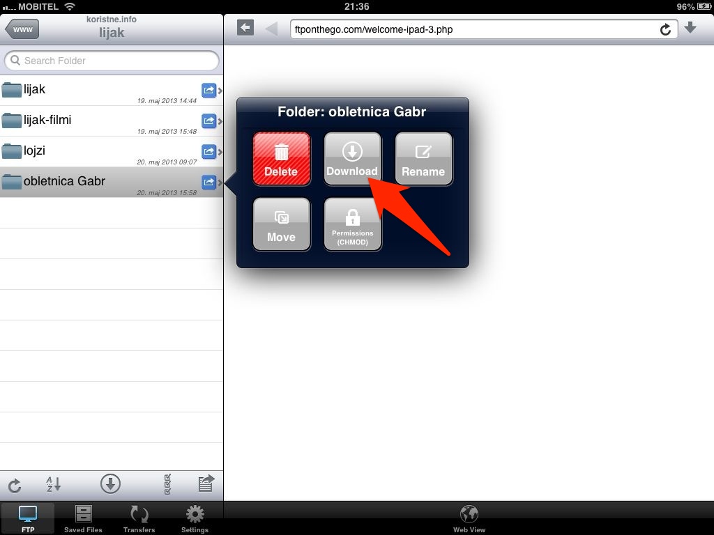 Pokaže se ti vsebina ftp-ja .... klikneš na modro puščico ob mapi ki jo želiš sneti in izbereš download.