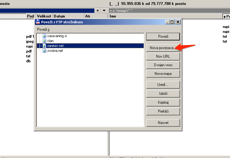 Izpolniš s svojimi podatki: seja (kar nekaj si izmisliš), ime gostitelja (server) npr caravaning.si, uporabnik, geslo