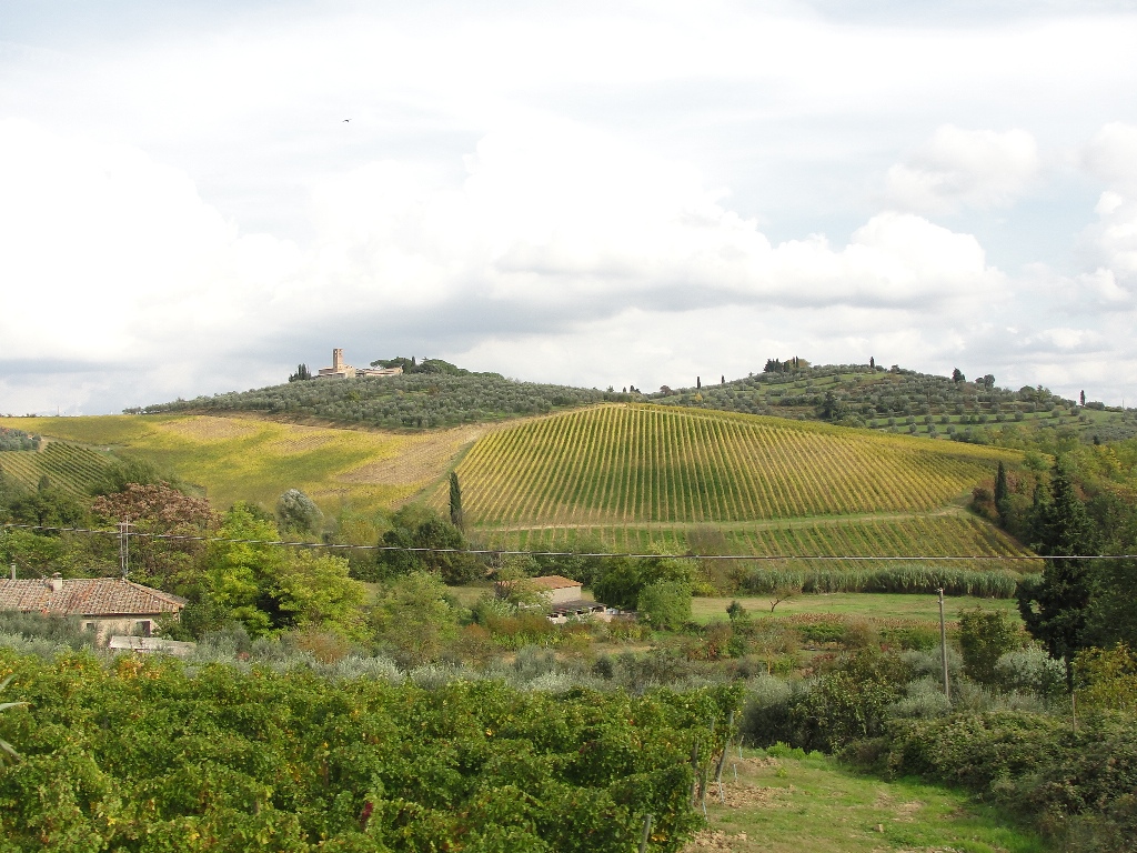 Kakor koli po zmahani štiripasovnici se peljemo v San Gimignano, ko ga v daljavi tudi zagledamo. Praktično ga je nemogoče zgrešiti saj so famozni stolpi vidni daleč naokoli. Po poti se začne tudi tista prava Toskana, taka kot sem jo imel v mislih z urejenimi vinogradi, oljčnimi nasadi in cipresami sem ter tja.