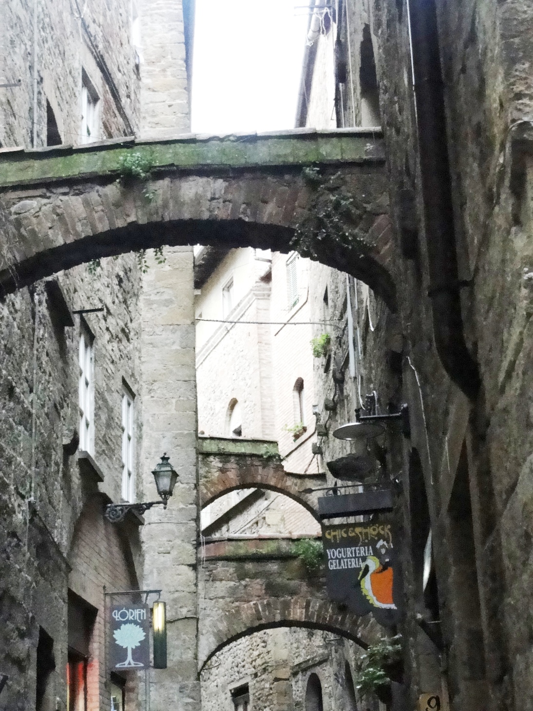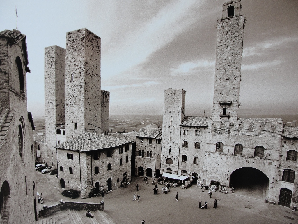 Gremo v mesto, vas, trdnjavo karkoli že je! Stolpi so res krasni in vzdušje na ulicah je prijetno. Za razliko od Firenc je tukaj v zraku čutiti vonjave iz bližnjih lokalov. Med kamnito zidanimi zgradbami hodimo od trga do trga in uživamo. Detajlov se ne manjka in pogled na okoliške kraje je čudovit. Imam občutek, da se je tam čas ustavil. Na osrednjem trgu Piazza della Cisterna si privoščimo “gellato”. Ta mali se v mestu razživi in vse ulice so njegove.