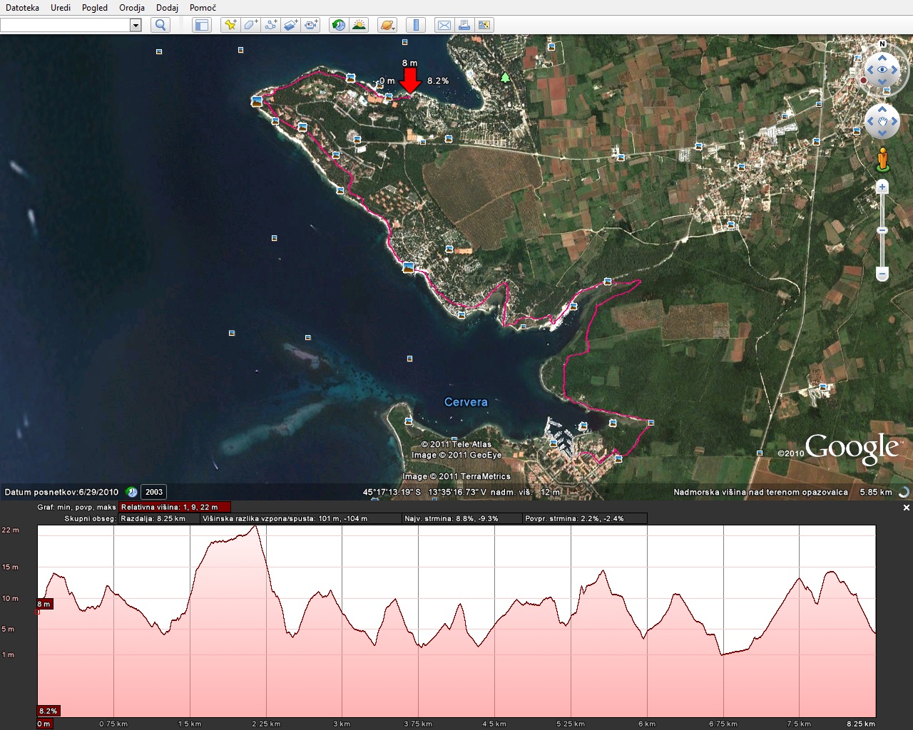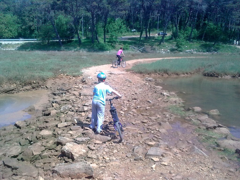 Otročje lahka trasa, ki smo jo prevozili se prične v neposredni bližini avtokampa Lanterna in vodi skozi turistično naselje Lanterna ter avtokamp Solaris, mimo ribiške restavracije do Červarja.